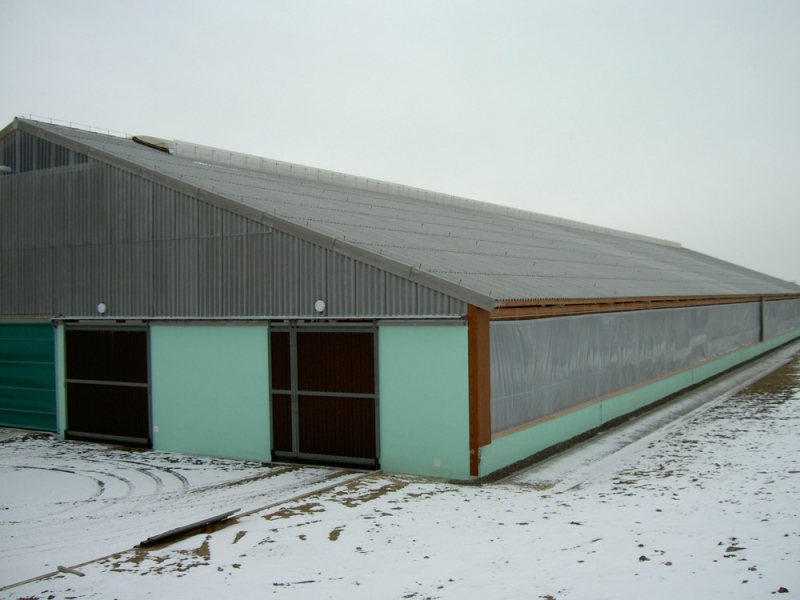 Newly built stable for dairy cows. Capacity of building is 384 productivity cows. Stable is solved with free boxing stabling in six-row arrangement with a central feed table. Bedding of resting boxes is with separator, shoveling manure using folding rope shovels, slurry then proceed to the pit, where is the separator. By fugato after separation of slurry the floor of the waiting room before parlor is washed away. This stable is completion of farm, in which already operates parallel parlor Farmtec 2 x 16 standing in full gear. On the sides of the stable is installed automatic roll sheet with traffic controlled by climatic conditions. The same control unit controls the operation of the internal fan.