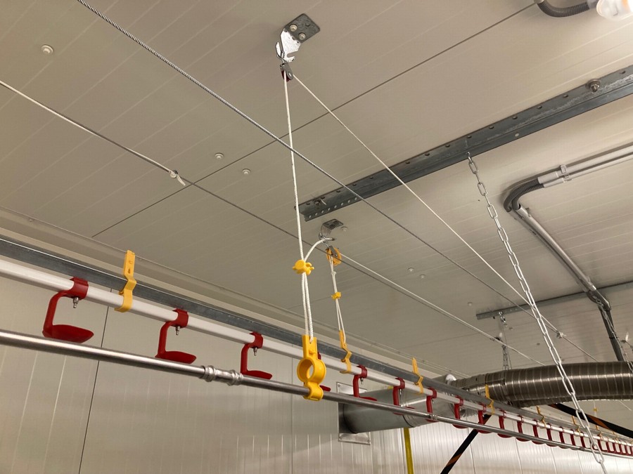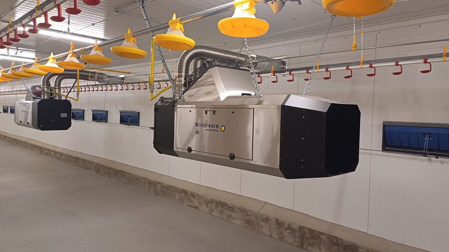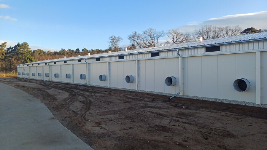 New construction of two halls for fattening broiler chickens, each with a capacity of 16,800 pcs. Individual feeding and drinking system are lifted by electric winches. Fiberglass feed silos are located near the halls, including load cells, a weighing module with a display. Both halls have a cross ventilation system with supply inlets on one side and exhaust chimneys located on the side of the barn on the other. The ventilation includes an alarm unit, emergency opening and a remote management system. The barn spaces are equipped with sensors for measuring temperature, humidity, negative pressure and CO2 concentration. Heating is provided by WinterWarm indirect combustion heaters. Two high-pressure cooling lines are also installed.