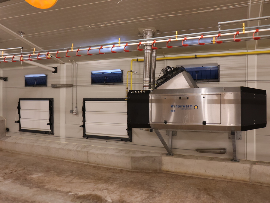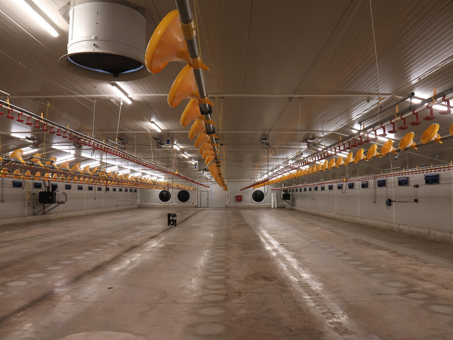 New construction of three halls and modernization of one hall for fattening broilers with a capacity of 100 000 pcs. All halls have feeding and water supply lines with lifting using electric winches with an above-standard density of nipples and feeders. Halls No. 1 and 2 use cross ventilation and hall No. 4 is designed with negative pressure ventilation with tunnel elements. The ventilation system includes an alarm, emergency opening and a remote management system. The stable areas are monitored by sensors for temperature, humidity, negative pressure and Co₂ concentration. Heating is provided by WinterWarm indirect combustion heaters. The halls include high-pressure cooling lines, and lighting is provided by ceiling LED lights.