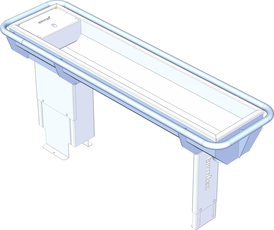 Těleso žlabu se skládá z žárově zinkovaného skeletu a nerezové vany, v níž je vodní hladina. Varianta nohy N nerezový svařenec pro upevnění žlabu do betonu, výšku hladiny žlabu určíte hloubkou uložení v betonu.