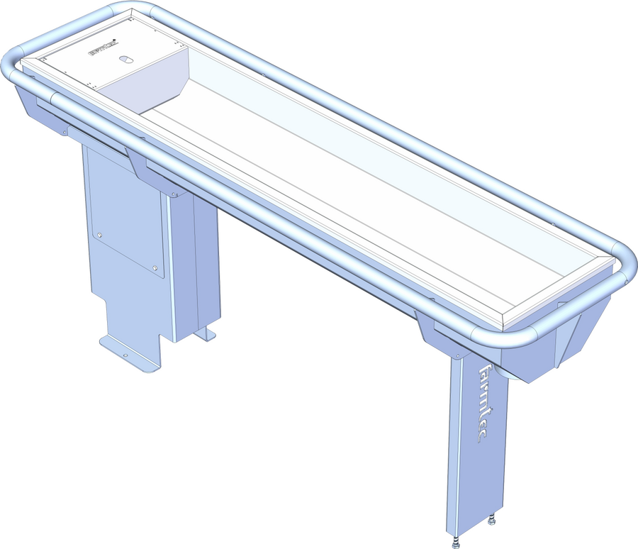 Těleso žlabu se skládá z žárově zinkovaného skeletu a nerezové vany, v níž je vodní hladina. Varianta nohy Z žárově zinkovaný svařenec pro upevnění žlabu do betonu, výšku hladiny žlabu určíte hloubkou uložení v betonu.