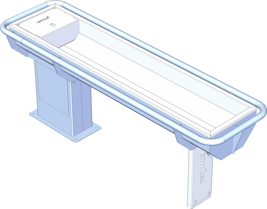Těleso žlabu se skládá z žárově zinkovaného skeletu a nerezové vany, v níž je vodní hladina. Varianta nohy Z žárově zinkovaný svařenec pro upevnění žlabu na hotový beton s výškou hladiny žlabu 800 mm nad podlahou.