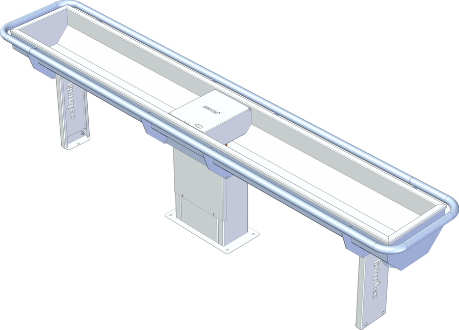 Těleso žlabu se skládá z žárově zinkovaného skeletu a nerezové vany, v níž je vodní hladina. Varianta nohy N nerezový svařenec pro upevnění žlabu na hotový beton s výškou hladiny žlabu 800 mm nad podlahou.