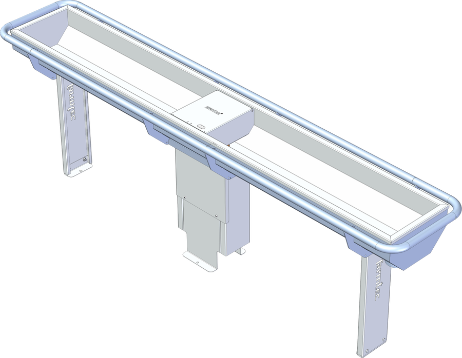Těleso žlabu se skládá z žárově zinkovaného skeletu a nerezové vany, v níž je vodní hladina. Varianta nohy N nerezový svařenec pro upevnění žlabu do betonu, výšku hladiny žlabu určíte hloubkou uložení v betonu.