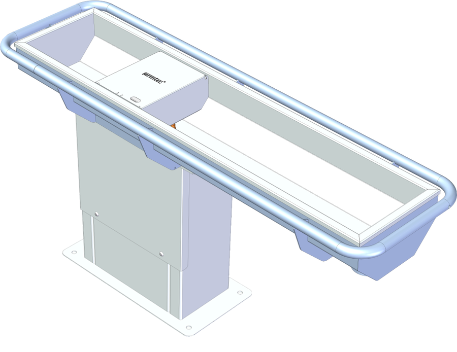 Těleso žlabu se skládá z žárově zinkovaného skeletu a nerezové vany, v níž je vodní hladina. Varianta nohy N nerezový svařenec pro upevnění žlabu na hotový beton s výškou hladiny žlabu 800 mm nad podlahou.