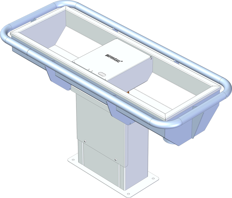 Těleso žlabu se skládá z žárově zinkovaného skeletu a nerezové vany, v níž je vodní hladina. Varianta nohy N nerezový svařenec pro upevnění žlabu na hotový beton s výškou hladiny žlabu 800 mm nad podlahou.