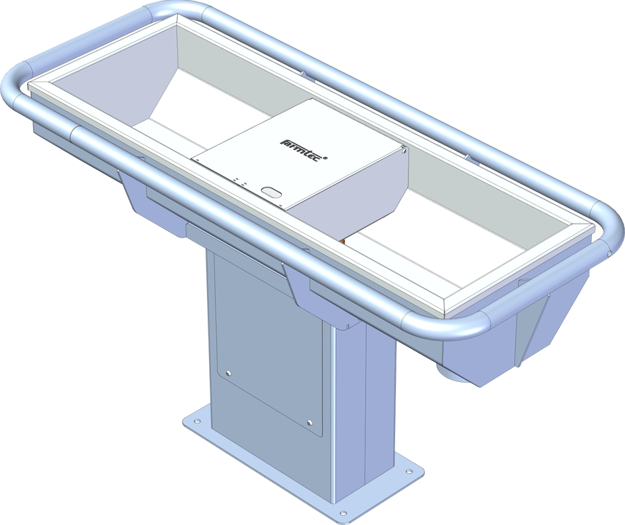 Těleso žlabu se skládá z žárově zinkovaného skeletu a nerezové vany, v níž je vodní hladina. Varianta nohy Z žárově zinkovaný svařenec pro upevnění žlabu na hotový beton s výškou hladiny žlabu 800 mm nad podlahou.