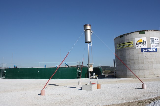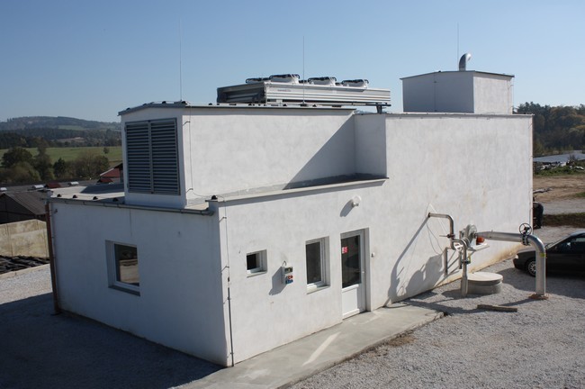 Bioplynová stanice FARMTEC s výkonem 834 kW GE; fermentory kruh v kruhu se samostatným plynojemem; kogenerační jednotka umístěna v budově strojovny.