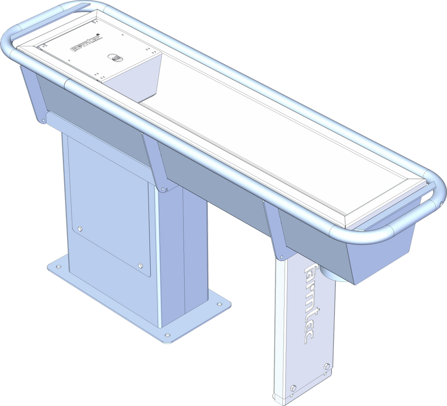 Těleso žlabu se skládá z žárově zinkovaného skeletu a nerezové vany, v níž je vodní hladina. Varianta nohy Z žárově zinkovaný svařenec pro upevnění žlabu na hotový beton s výškou hladiny žlabu 800 mm nad podlahou.