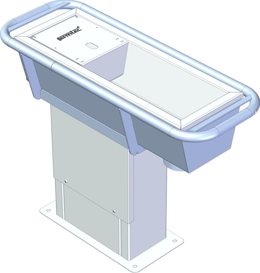 Těleso žlabu se skládá z žárově zinkovaného skeletu a nerezové vany, v níž je vodní hladina. Varianta nohy N nerezový svařenec pro upevnění žlabu na hotový beton s výškou hladiny žlabu 800 mm nad podlahou.