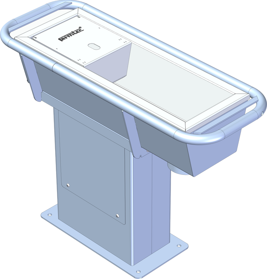 Těleso žlabu se skládá z žárově zinkovaného skeletu a nerezové vany, v níž je vodní hladina. Varianta nohy Z žárově zinkovaný svařenec pro upevnění žlabu na hotový beton s výškou hladiny žlabu 800 mm nad podlahou.