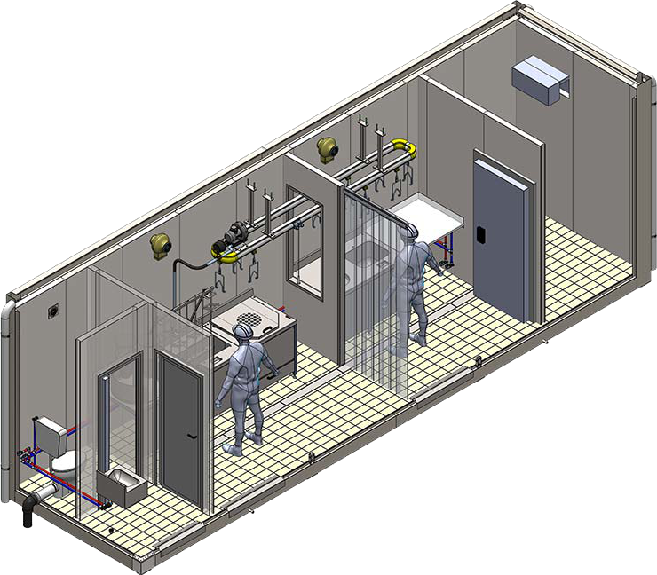 Kontejner se skládá z žárově pozinkovaných ocelových profilů, které jsou součástí nosné konstrukce, tato konstrukce je pokryta sendvičovými panely vhodnými pro kontakt s potravinářskými výrobky, s polyuretanem uvnitř pro zajištění dobré tepelné izolace. Na zemi je umístěna protiskluzová podlaha. Kontejnery nabízíme ve čtyřech variantách dle vybavení: var. 0010, var. 0020, var. 0030, var. 0040.